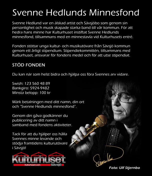 Svenne var en älskad profil, både lokalt och nationellt. Som frontfigur i legendariska Hep Stars var han en av Sveriges stora popröster, men för många i Sävsjö var han också en varm, ödmjuk och jordnära person som alltid ställde upp. Minnesfonden skapades för att hedra just den sidan av honom – människan bakom musiken.